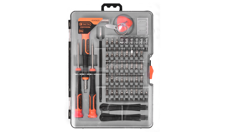 • 1 pc precision screwdriver handle • 2 pc precision screwdriver STAR 0.8; PH #00 • 2 pc plastic opening sticks • 1 pc 40 mm suction cup • 1 pc 60 mm extension bar • 6 pc nut drivers: M2.5, 3.0, 3.5, 4.0, 4.5, 5.0 mm • 36 pc H4 x 28 mm S2 precision bits: SLOT: 1.0, 1.5, 2.0, 2.5, 3.0, 3.5, 4.0 mm PH: #000, #00, #0, #1 TORX: T3, T4, T5, T6, T7, T8, T9, T10, T15 & T20 HEX: 0.9, 1.3, 1.5, 2.0, 2.5, 3.0, 4.0 mm TRIANGLE: 2.0, 3.0 TRI-WING: Y2.0 U-SHAPE: U2.6 STAR: 0.8, 1.2, 1.5 ROUND: R0.8